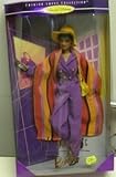 Collector Edition. Fashion Savvy Collection 1998 Uptown Chick Barbie #19632 wears a purple jumpsuit with a long striped wrap and a yellow hat. She carries a shoulder bag, a cell phone, and golden eyeglasses. She uses the 1992 Teresa head mold with light brown skin tone and cropped hair. Each doll in this series has rooted eyelashes.
